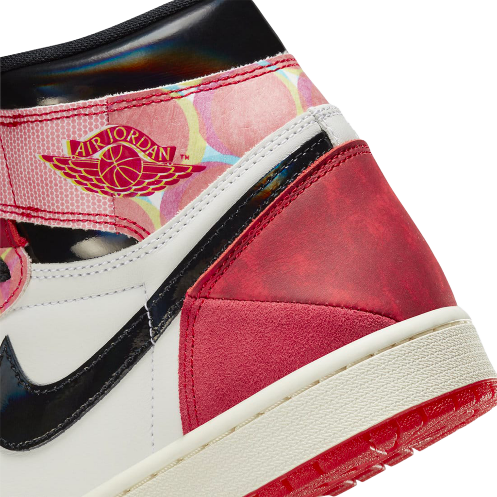 La semelle extérieure légèrement translucide et la semelle intermédiaire blanche permettent de conserver l’ADN classique de la Air Jordan 1 tout en laissant s’exprimer l’esthétique moderne du Spider-Verse. L’ensemble donne une sneaker expressive, originale et clairement identifiable comme une édition 2023, pensée comme un lien entre cinéma, streetwear et culture sneaker.